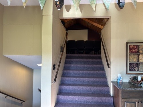 While in the foyer, you may either go upstairs into the sanctuary for the service, or downstairs to the children's classrooms.